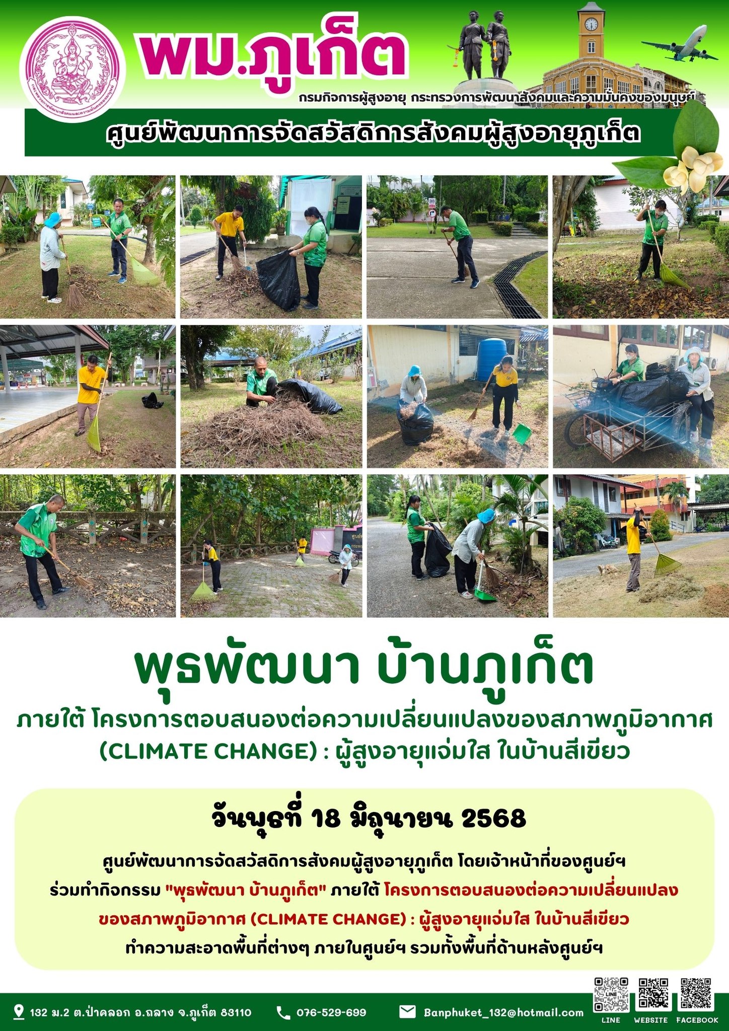 18 มิ.ย. 2568 1,914วันพุธที่ 18 มิถุนายน 2568 ศูนย์พัฒนาการจัดสวัสดิการสังคมผู้สูงอายุภูเก็ต โดยเจ้าหน้าที่ของศูนย์ฯร่วมทำกิจกรรม "พุธพัฒนา บ้านภูเก็ต" ภายใต้ โครงการตอบสนองต่อความเปลี่ยนแปลงของสภาพภูมิอากาศ (CLIMATE CHANGE) : ผู้สูงอายุแจ่มใส ในบ้านสีเขียวทำความสะอาดพื้นที่อาคารต่างๆ ภายในศูนย์ฯ รวมทั้งพื้
